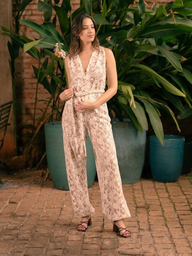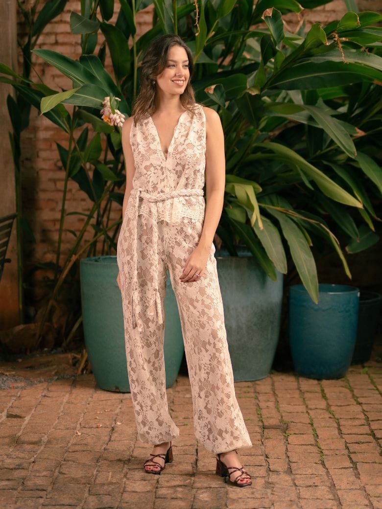 Descubra a elegância da Blusa Renda Off White, confeccionada em renda delicada na tonalidade off white. Seu decote em V realça o colo com graça, enquanto a transparência sutil valoriza o desenho do tecido. A modelagem fluida proporciona conforto e um caimento natural. O destaque fica por conta do cinto trançado, que ajusta a cintura com charme, finalizando a peça com um toque de requinte indispensável ao seu guarda-roupa.