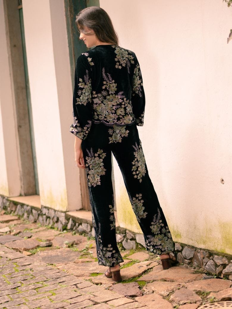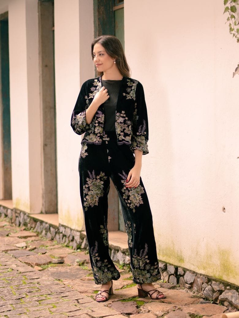 Com modelagem ampla que alonga a silhueta, é confeccionada em veludo com bordados delicados, garantindo um caimento fluido e elegante. O cós com dois elásticos oferece ajuste perfeito, enquanto o zíper nas costas facilita o vestir. Uma peça versátil para composições modernas e refinadas.
