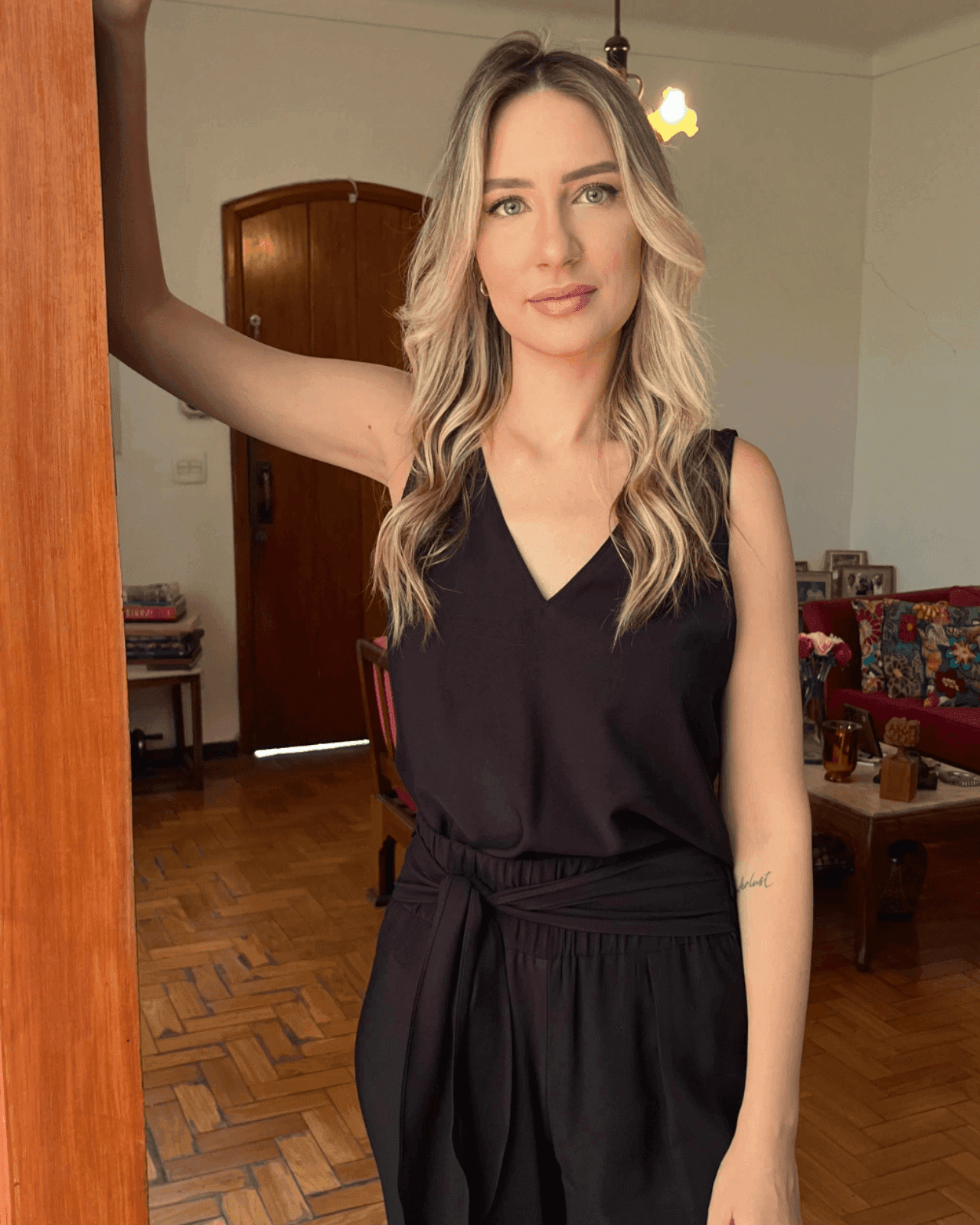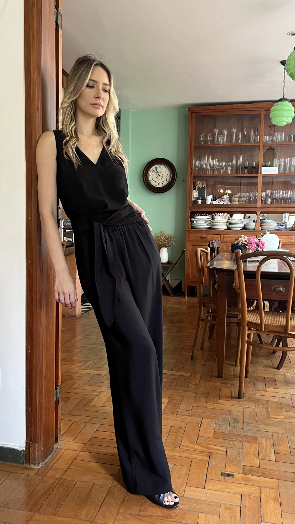 Regata com decote em V, feita em tecido cor preto.