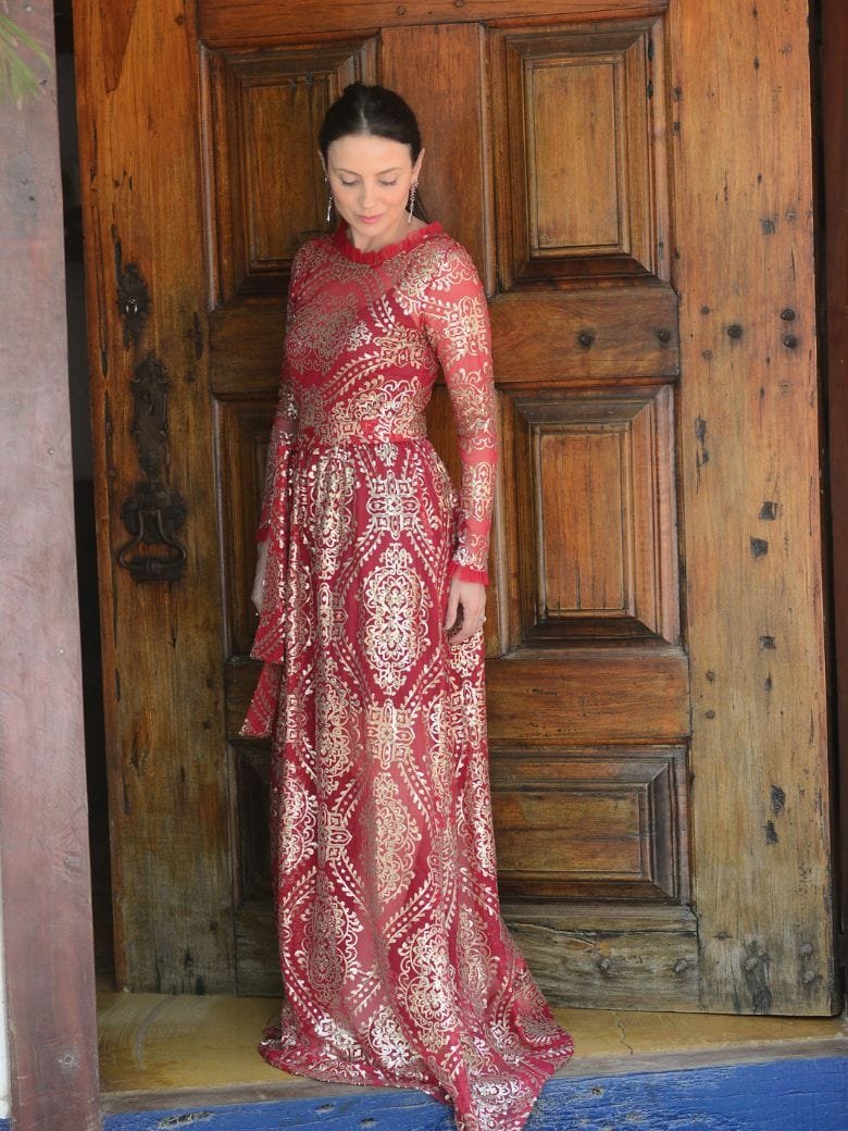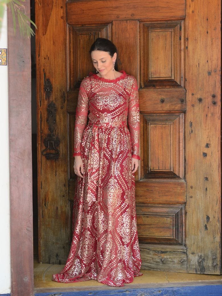A base em tom vermelho vibrante contrasta com o brilho dourado dos paetês, criando um efeito luminoso perfeito para eventos noturnos. Ideal para quem busca uma produção marcante e refinada.