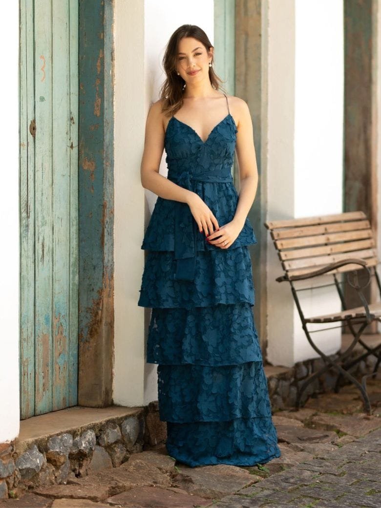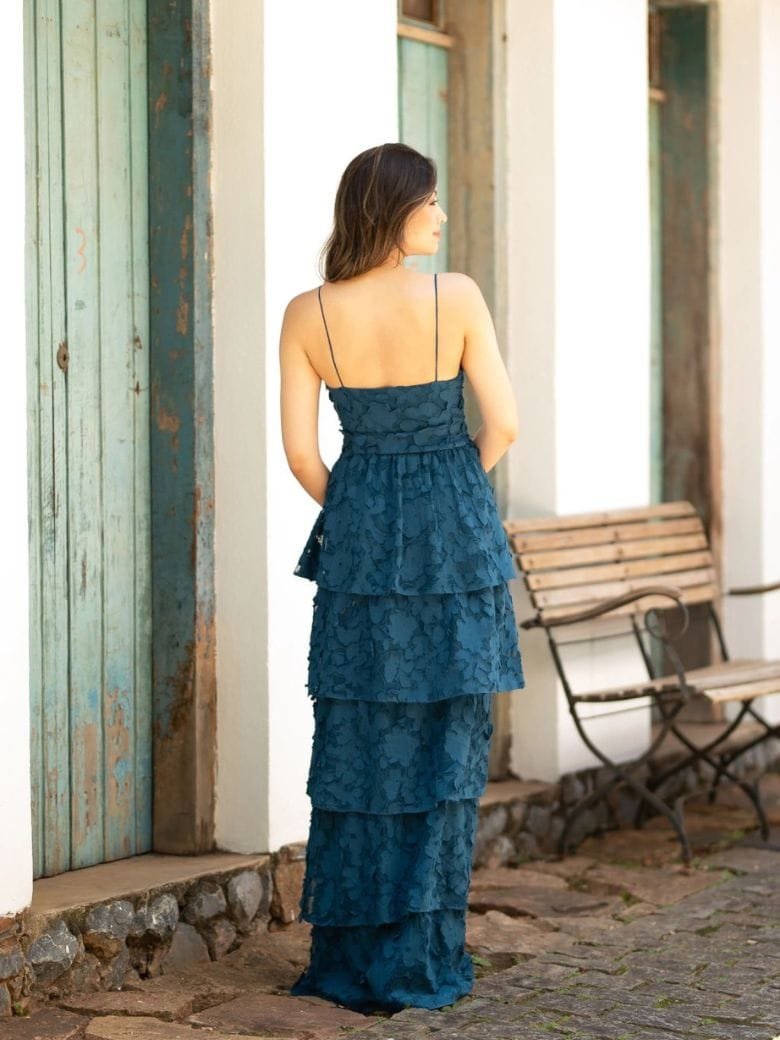 O Vestido Liana é a escolha perfeita para quem busca sofisticação e delicadeza em um único look. Confeccionado em tule bordado na belíssima cor azul petróleo, este vestido destaca-se pelos detalhes finos e acabamento primoroso.