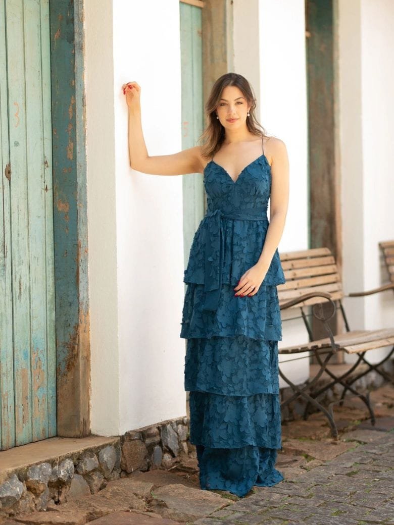 Com alcinhas delicadas e cintura marcada, ele valoriza a silhueta com elegância. A charmosa saia em camadas proporciona um movimento fluido, ideal para eventos especiais. Além disso, acompanha uma faixa do mesmo tecido, permitindo ajustar o caimento conforme seu desejo.