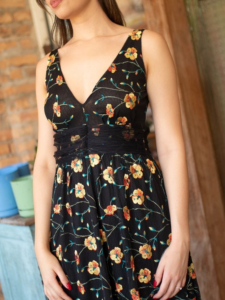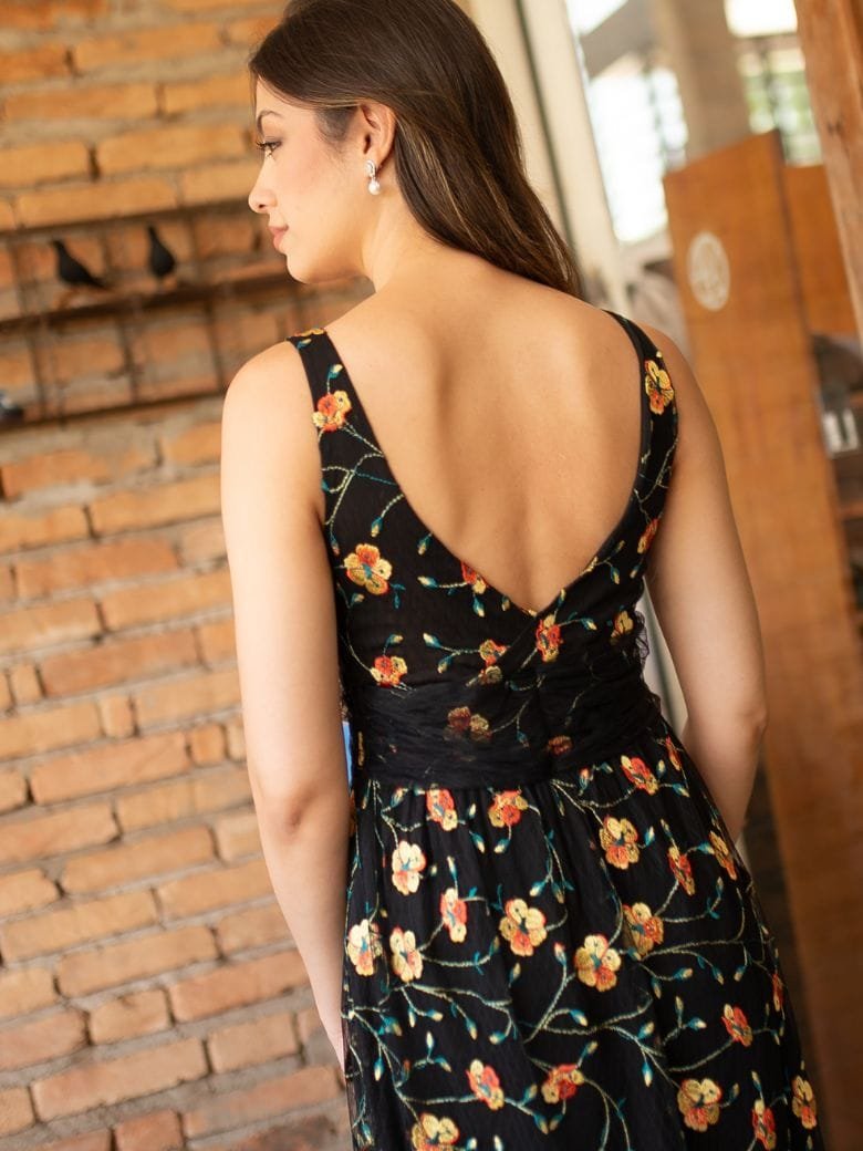 Vestido Siena Encante-se com o Vestido Siena, uma peça que traduz leveza e romantismo em cada detalhe. Confeccionado em tule leve de poliamida com delicado bordado floral, oferece uma transparência sutil que valoriza o fundo preto, evidenciando o requinte da estampa.